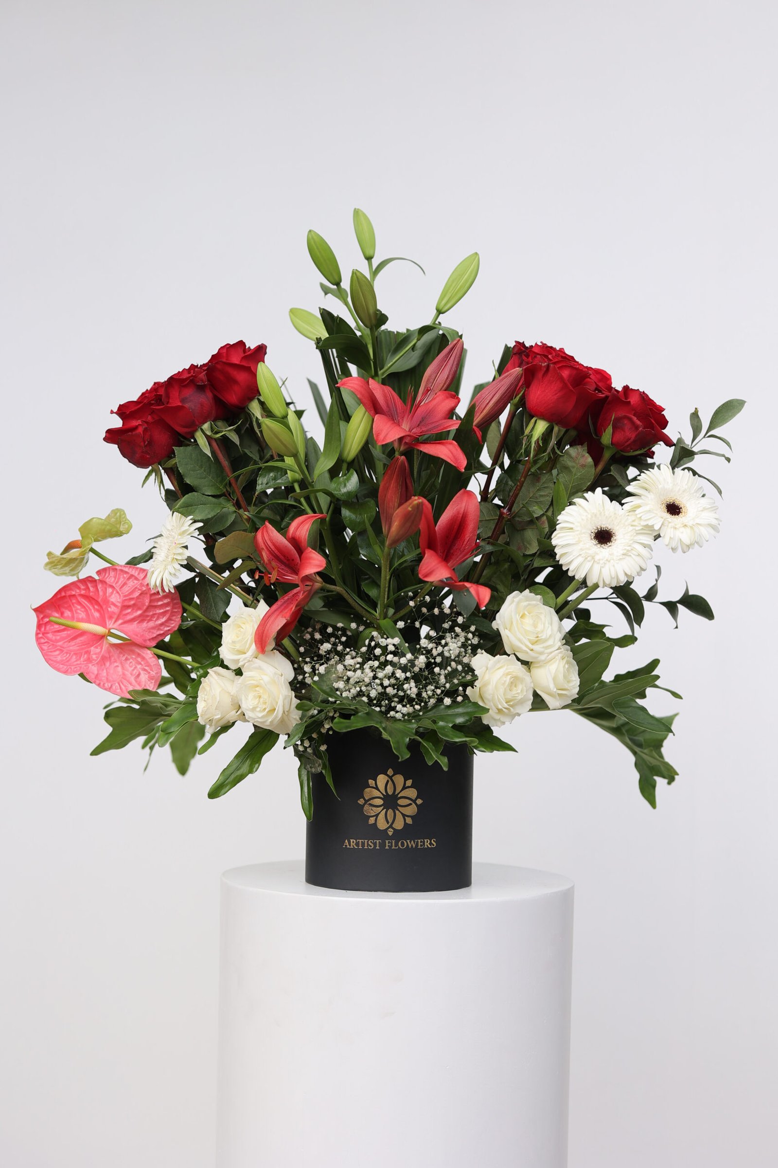 Black box with red roses and jasmine touch, blending romance and elegance.