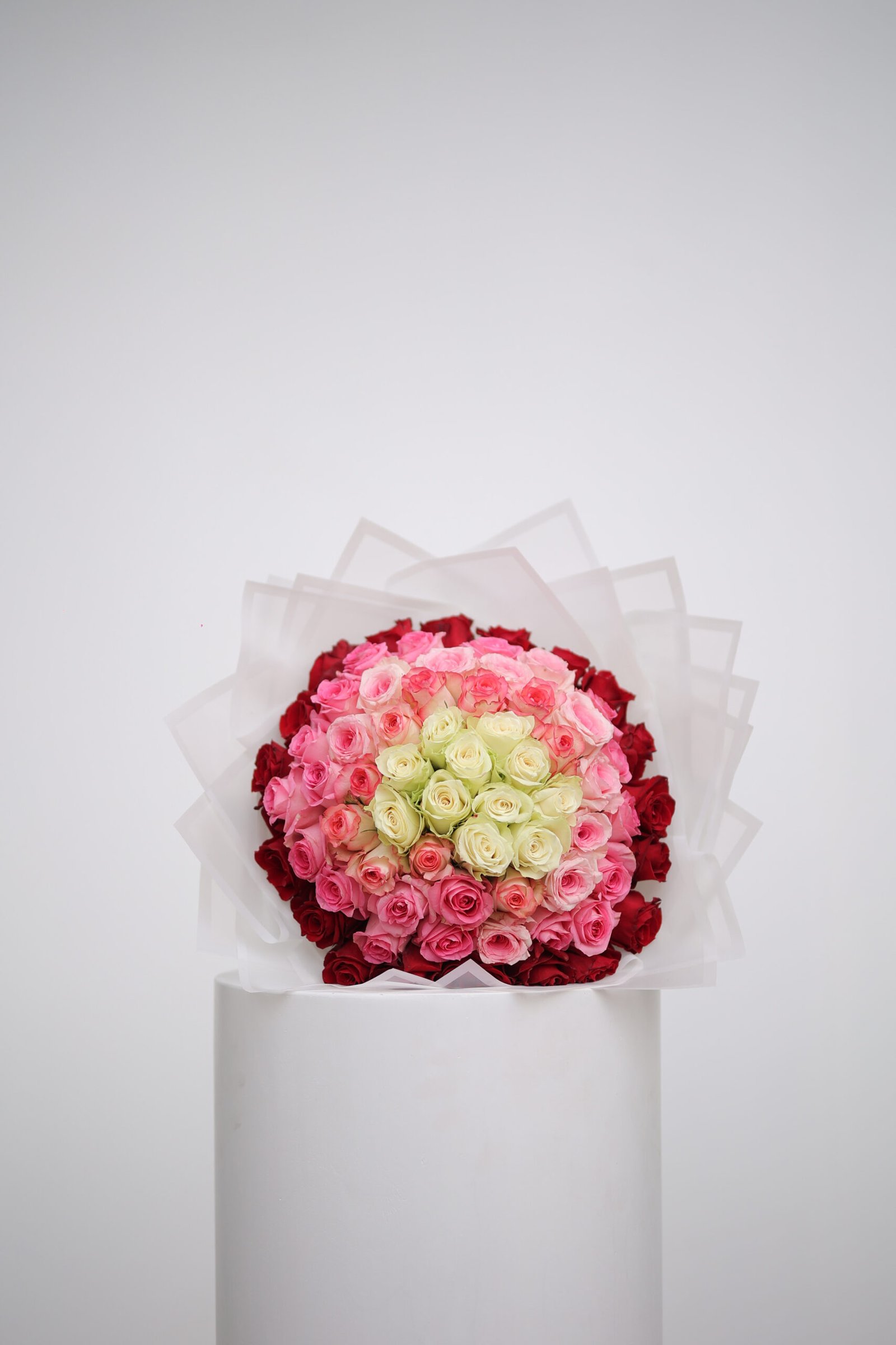 Elegant bouquet of pink, white, and red roses, blending softness and passion in perfect harmony.