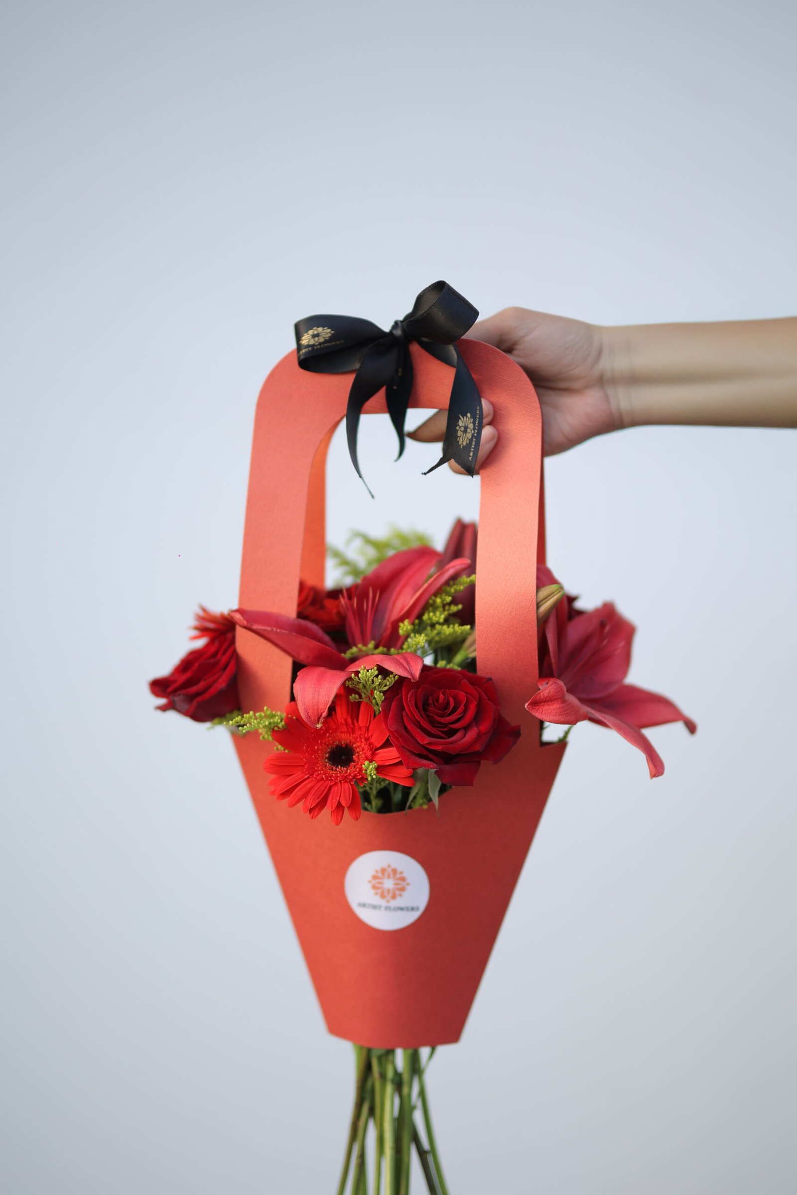 شنطة أنيقة تحتوي على ورد أحمر، هدية مثالية للتعبير عن الحب.